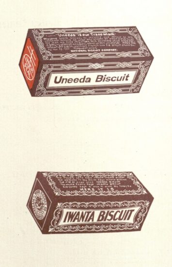 — From a series of illustrations and photographs used as evidence in litigation, part of an exhibition (“Law’s Picture Books”) at NYC’s Grolier Club of more than 140 items from the Yale Law Library’s collection of images and writings on legal themes. The case of the rival cookie boxes resulted in a court’s finding in 1899 that the National Biscuit Co., maker of Uneeda, was entitled to an injunction.