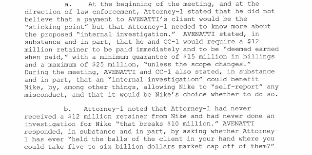 As in many other situations, the question arises: what would the legal difference be between extortion and ordinary lawyer behavior in settlement negotiations? Part of the answer is that Avenatti was alleged to be angling for his own, rather than the client’s advantage. From p. 9 of the New York complaint: